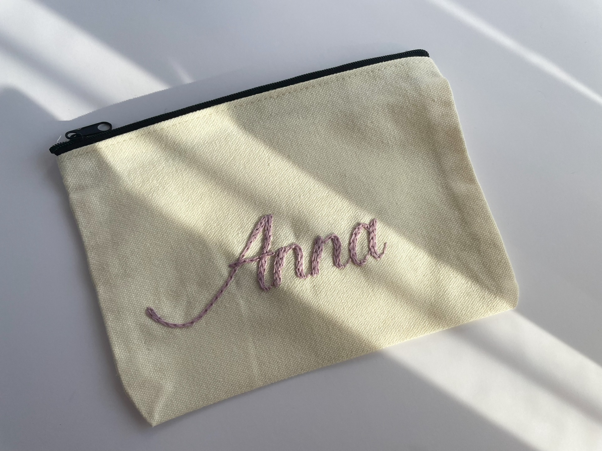 1 db névre szóló neszesszer - bézs, 14 × 20 cm méretű, cipzáras, vászonszövet anyagból